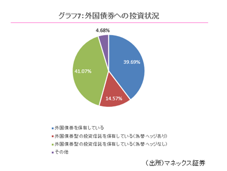 また、外国債券を保有していると回答した個人投資家に商品種別についてたずねたところ、「外国債券型の投資信託を保有している(為替ヘッジなし)」が41.07%で最も多く、次いで「外国債券を保有している」が39.69%という結果となりました。外国債券への投資においては、外国債券への直接投資よりも投資信託を通じて保有している個人投資家が比較的多いことがうかがえます。