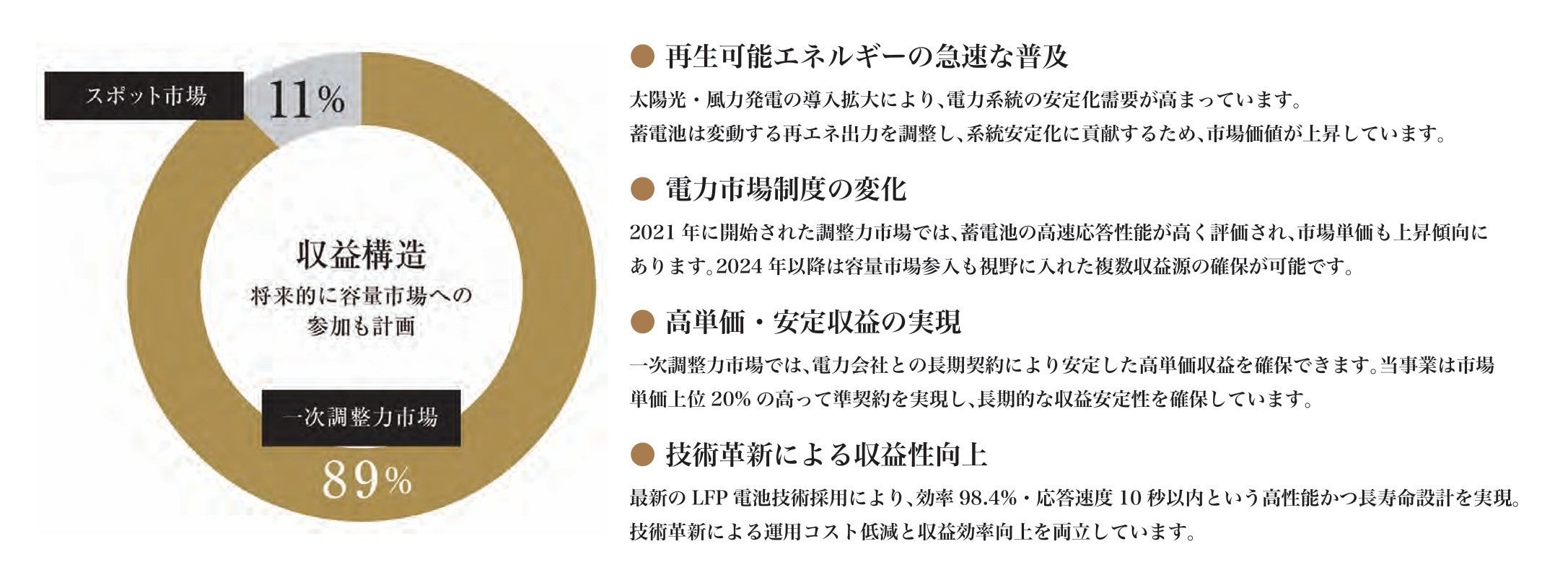 本ファンドの収益は、一次調整力市場での高単価契約を主軸 (約89%)とし、スポット市場取引(約11%)で補完する安定的な二本立て構造です。さらに将来的には容量市場への参入も計画しており、多様な収益源を確保していきます。 電力系統の脱炭素化が進む現在、系統用蓄電池の市場需要は今後10年で10倍以上に拡大すると予測されており、 先行者利益を確保できる有望な投資機会となっています。
