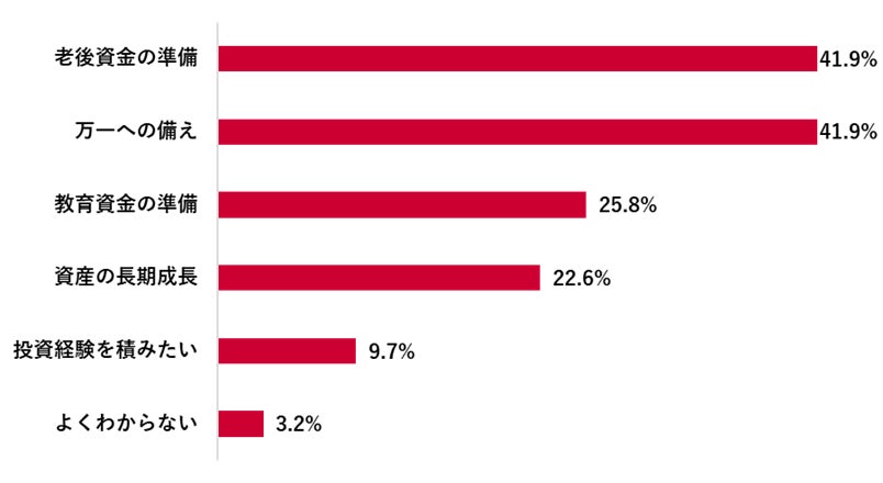 資産形成手段としての魅力について「とても魅力的」が9.7%、「ある程度魅力的」が67.7%となり、合わせて77.4%と高かった。利用目的では「老後資金の準備」「万一への備え」がともに41.9%でトップとなった。