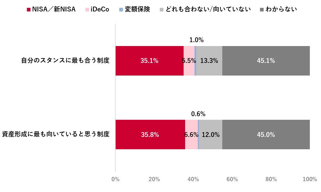 自身の資産形成のスタンスに合う制度が「わからない」が45.1%で最多、「NISA・新NISA」は35.1%