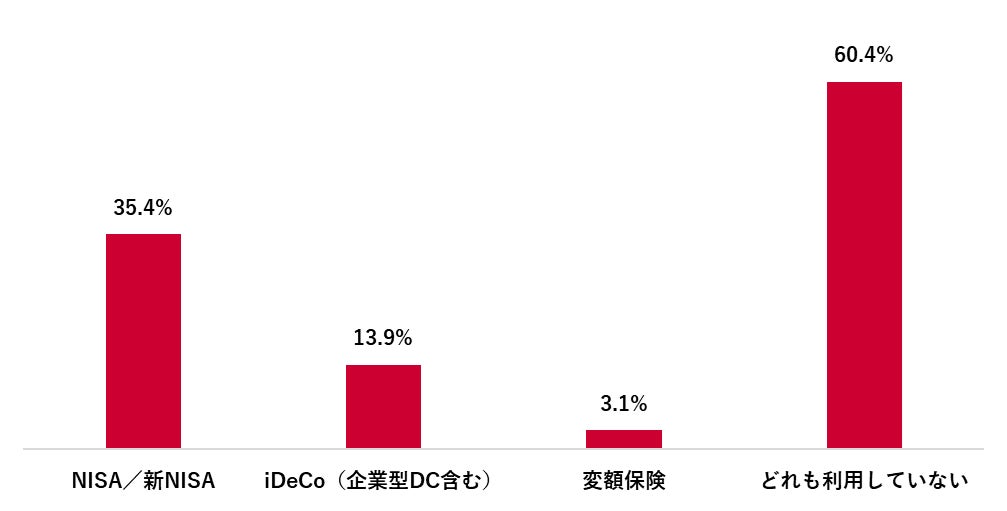 現在利用している制度・商品を聴取したところ、「NISA/新NISA」が35.4%、「iDeCo(企業型DC含む)」が13.9%、「変額保険」は3.1%だった。また、「どれも利用していない」が60.4%と最多となった。