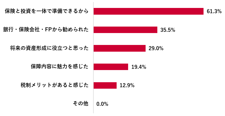 変額保険加入者に加入理由を尋ねたところ、「保険と投資を一体で準備できるから」が61.3%で最多となり、「銀行・保険会社・FPから勧められた」35.5%、「将来の資産形成に役立つと思った」29.0%が続いた。