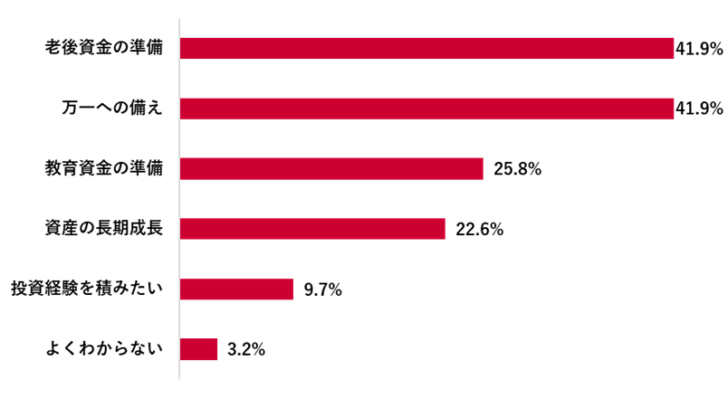 資産形成手段としての魅力について「とても魅力的」が9.7%、「ある程度魅力的」が67.7%となり、合わせて77.4%と高かった。利用目的では「老後資金の準備」「万一への備え」がともに41.9%でトップとなった。