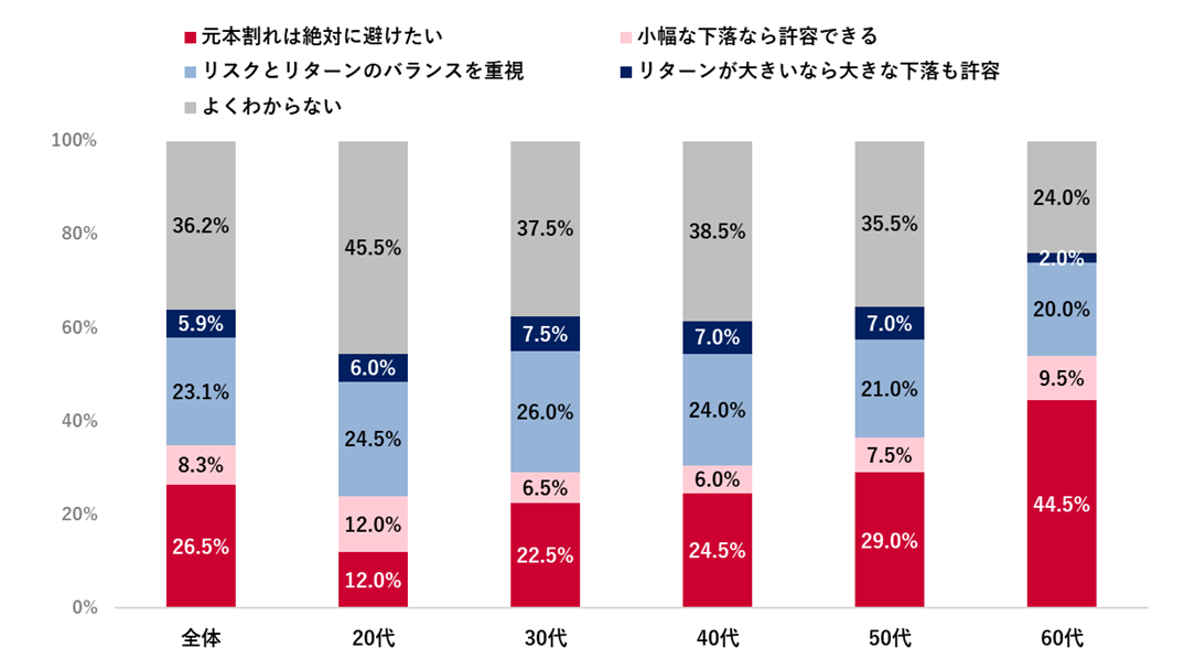 年代別に見ると、60代では「元本割れは絶対に避けたい」が44.5%と突出して高く、高齢層ほどリスク回避志向が強い傾向が明確となった。