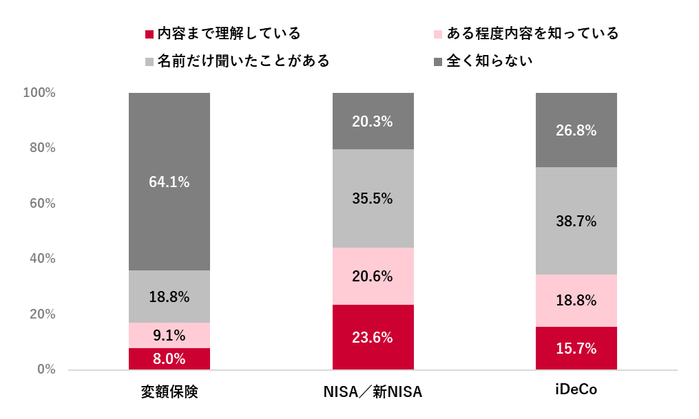 変額保険の認知率は、約6割が「全く知らない」。NISA・新NISA、iDeCoとの差が大きい