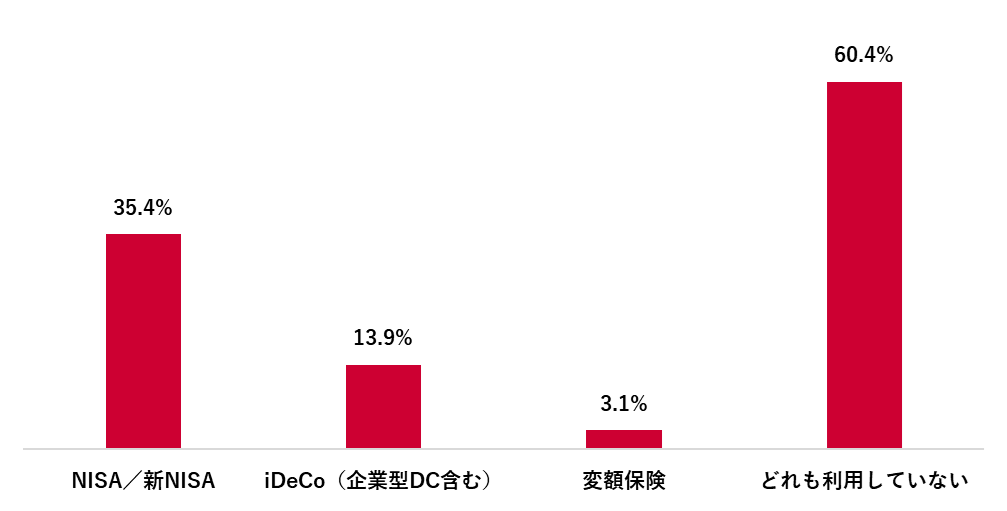 現在利用している制度・商品を聴取したところ、「NISA/新NISA」が35.4%、「iDeCo(企業型DC含む)」が13.9%、「変額保険」は3.1%だった。また、「どれも利用していない」が60.4%と最多となった。