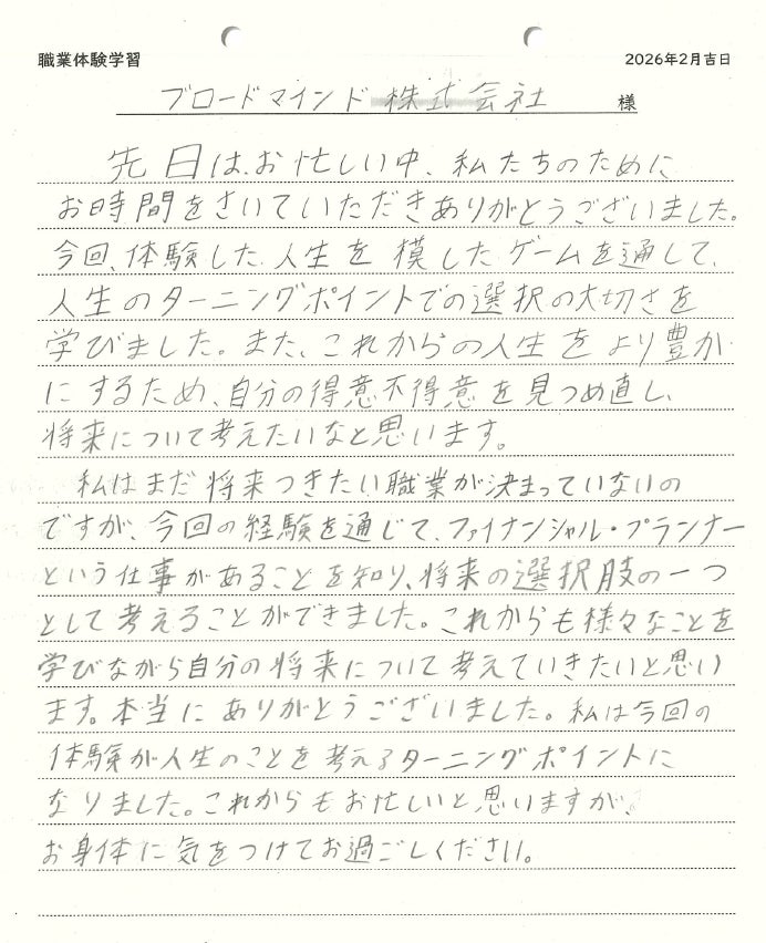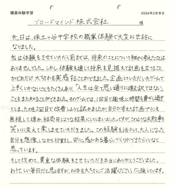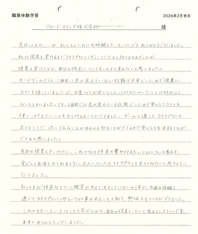 「金融の力を解き放つ」をパーパスに掲げ、ライフプラン実現を支援する金融サービスの開発・提供を手掛けるブロードマインド株式会社は、カードゲームを用いた出前授業を2024年9月からこれまで3,000人超の児童生徒へ提供。今回は、2026年1月22日に横浜市立保土ヶ谷中学校の中学2年生25名へ授業を実施しました。