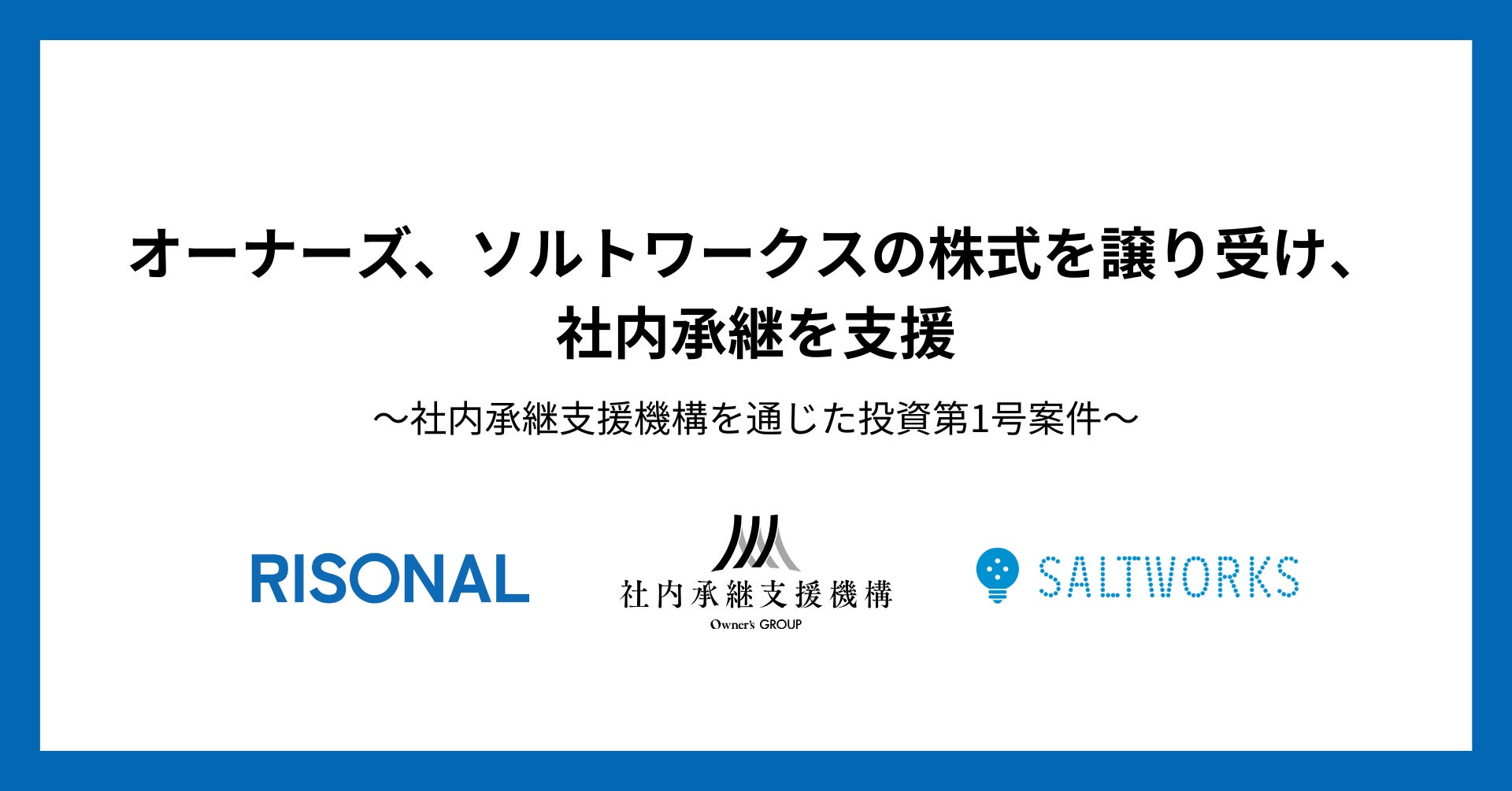 オーナーズ株式会社(本社:東京都港区、代表取締役:作田 隆吉、以下「オーナーズ」)は、社内承継支援サービス「RISONAL(リソナル)社内承継」の支援案件として、モバイルアプリ・Webサービスの企画・開発・運営を行う株式会社ソルトワークス(以下「ソルトワークス」)の社内承継を支援いたします。