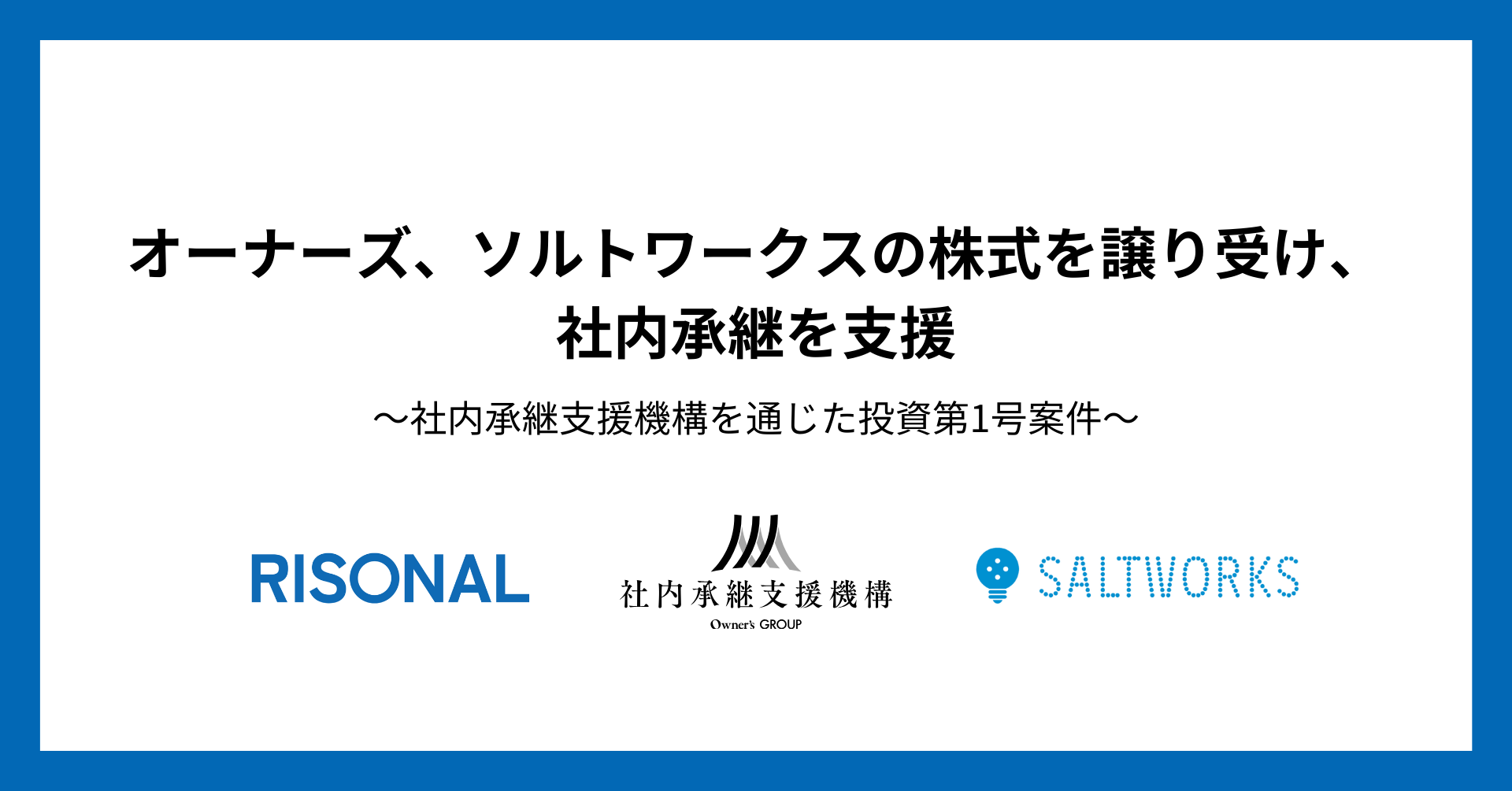 オーナーズ株式会社(本社:東京都港区、代表取締役:作田 隆吉、以下「オーナーズ」)は、社内承継支援サービス「RISONAL(リソナル)社内承継」の支援案件として、モバイルアプリ・Webサービスの企画・開発・運営を行う株式会社ソルトワークス(以下「ソルトワークス」)の社内承継を支援いたします。