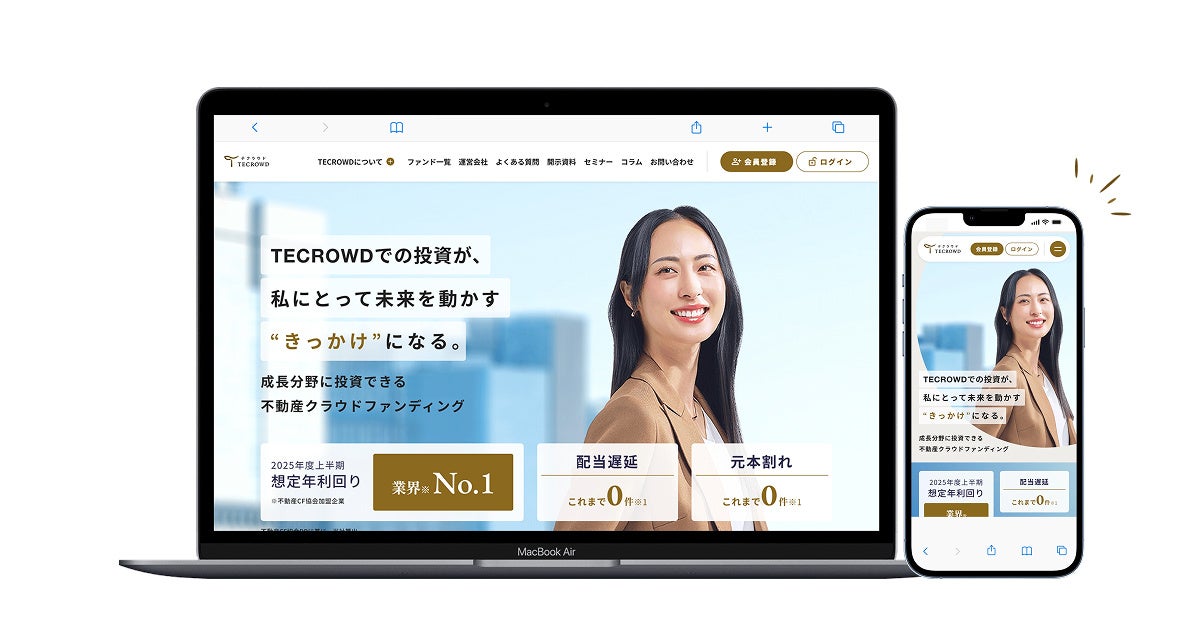 TECROWDは1口10万円から不動産に投資ができるサービス(クラウドファンディング)です。投資するにあたり物件選びから契約まで、すべてオンラインで完結するため、手軽に不動産への投資が始められます。