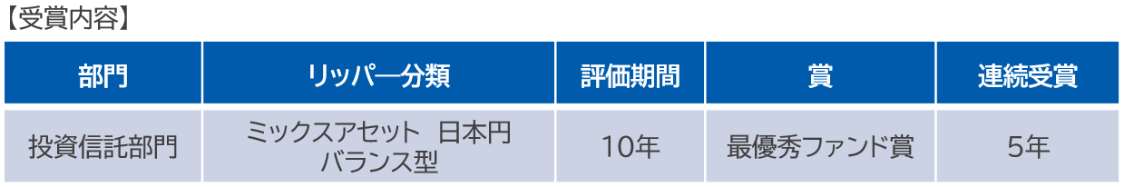 当ファンドは、株式と債券を半分ずつ組み合わせ、世界の国と地域に分散投資することで、リスクを抑えた運用を継続してまいりました。こうした運用のもと、安定した実績を積み重ねた結果、10年という長期の評価期間において高く評価されたものと受け止めております。
