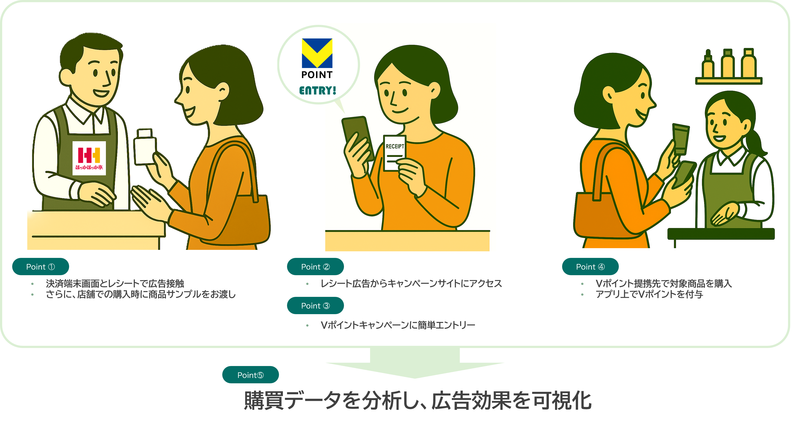 キャンペーンへのエントリー後、お客さまはVポイント提携先のスーパーマーケットやドラッグストアなどで対象商品を購入すると、Vポイントが付与されます。テイクアウト専門店での接触をきっかけに、小売店での購買を促すことで、サンプリングの効果を店舗を横断した販売チャネルに波及させ、メーカー商品の購買促進に寄与します。
