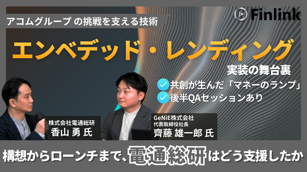 本セッションでは、GeNiE株式会社 代表取締役社長 齊藤 雄一郎 氏、株式会社電通総研 営業第二本部 エンタープライズ営業第1ユニット 金融ソリューション営業1部 香山 勇 氏より、アコムグループのエンべデッド・レンディングの将来像やそれを支えるシステムについてお話しいただきます。