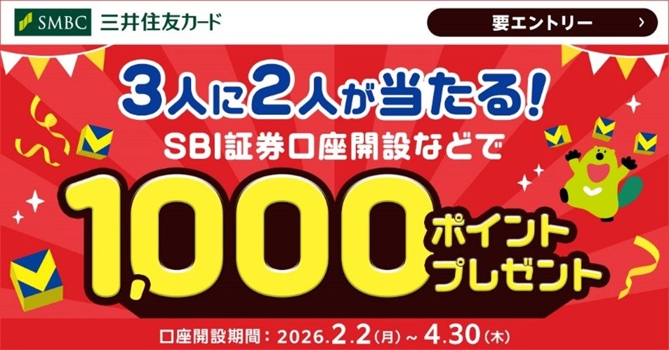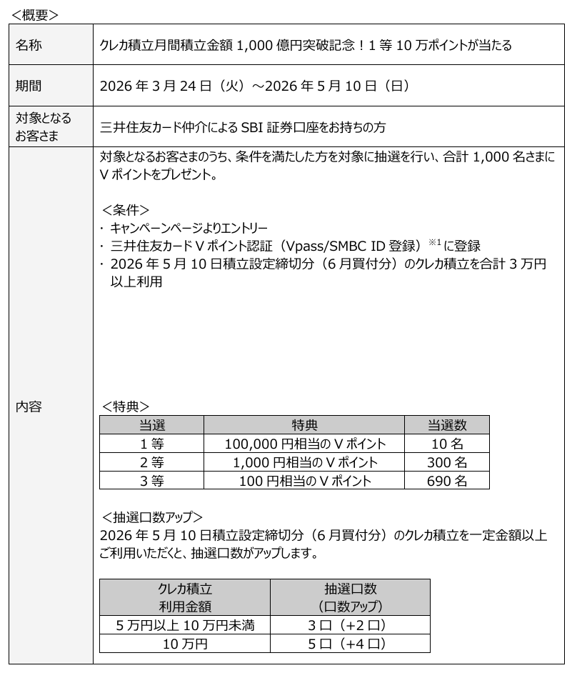 三井住友カード株式会社(本社:東京都江東区、代表取締役 社長執行役員 CEO:大西 幸彦、以下:三井住友カード)と株式会社SBI証券(本社:東京都港区、代表取締役社長:髙村 正人、以下:SBI証券)は、2026年3月に「三井住友カード つみたて投資(クレカ積立)」の月間積立金額が1,000億円を突破したことをお知らせいたします。