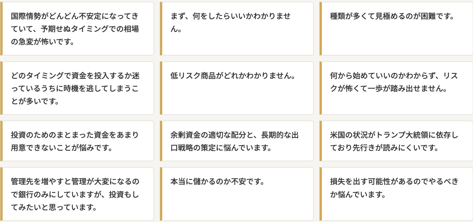 投資に関心を持ちながらも「情報の少なさ」「わからなさ」「怖さ」が実際の行動を妨げていることが伺えます。