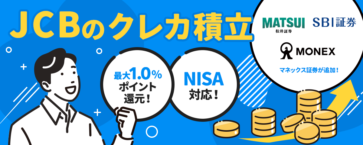 株式会社ジェーシービー (本社:東京都港区、代表取締役会長 兼 執行役員社長:二重 孝好、以下「JCB」)は、2026年3月26日(木)よりマネックス証券株式会社(本社:東京都港区、取締役社長執行役員:清明祐子、以下「マネックス証券」)との間で、クレジットカードで投資信託の買い付けが行える、「JCBのクレカ積立」の提供を開始いたします。また、新サービスの提供開始にあわせて、「JCBのクレカ積立利用で最大10%キャッシュバックキャンペーン」を実施します。