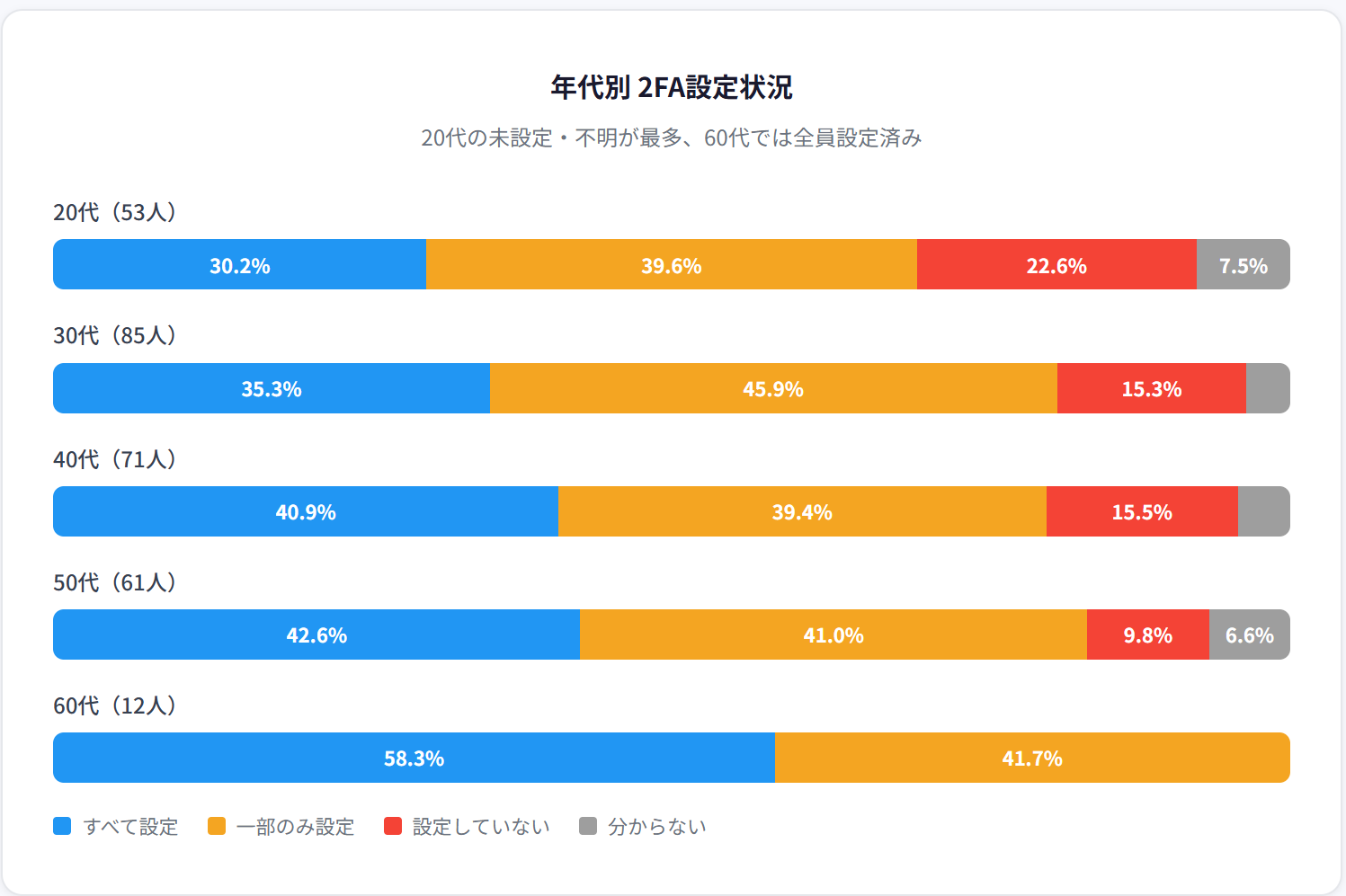 これに対し、60代の層では全員が何らかの形で2FAを設定しており、慎重な運用姿勢が際立っています。