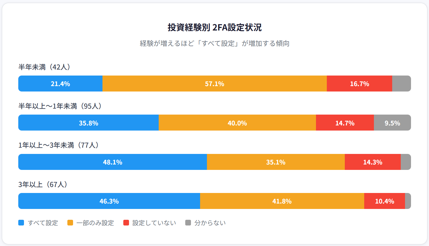 投資経験年数別に2FAの設定状況を分析したところ、経験が増えるほど「すべてのサービスで設定」する割合が高まる傾向が確認されました。