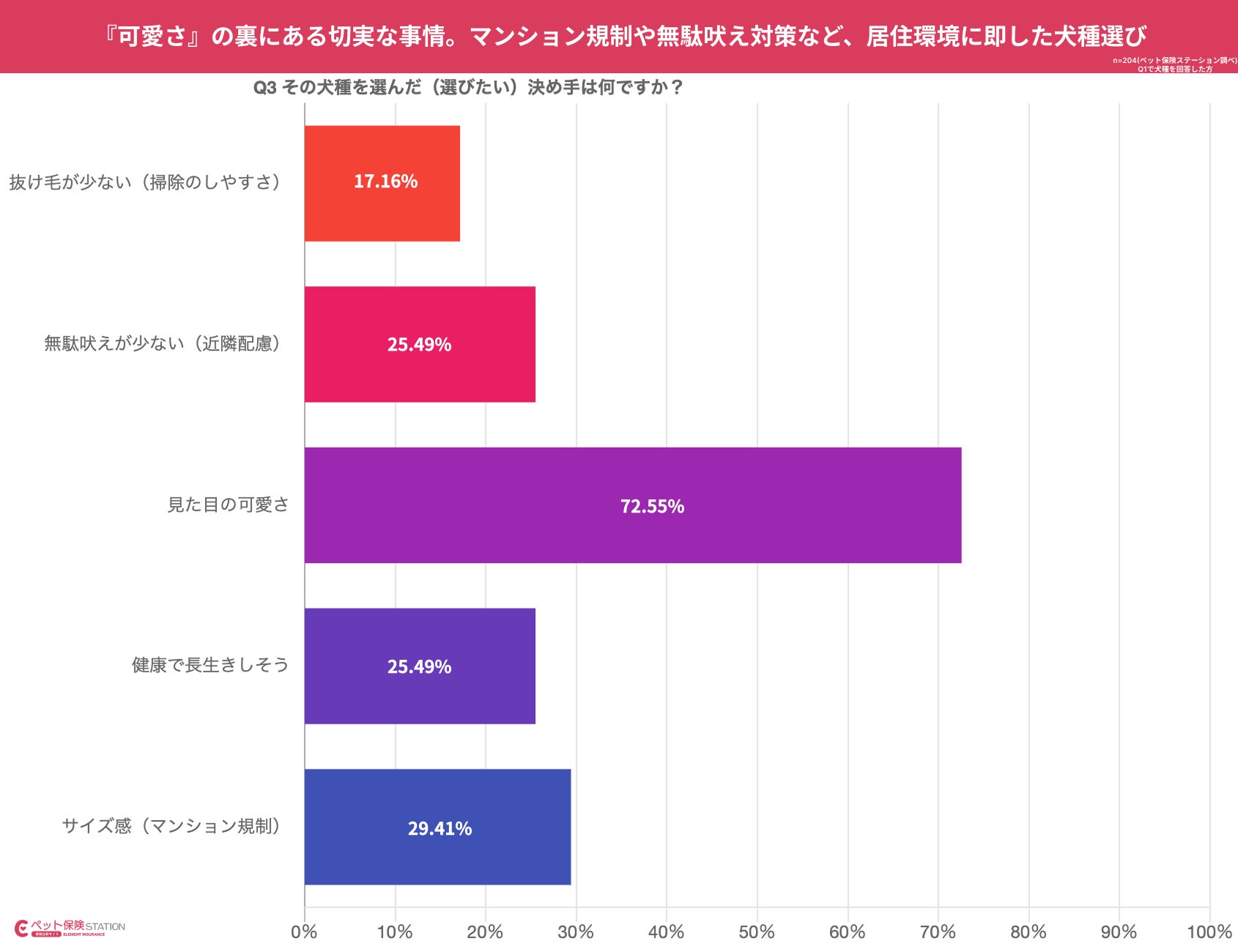 しかし、次点には「サイズ感(マンション規制)」(29.41%)や「無駄吠えの少なさ」(25.49%)が続いており、住宅事情や近隣への配慮といった現実的な制約が、犬種選びに強く影響している実態が判明しました。