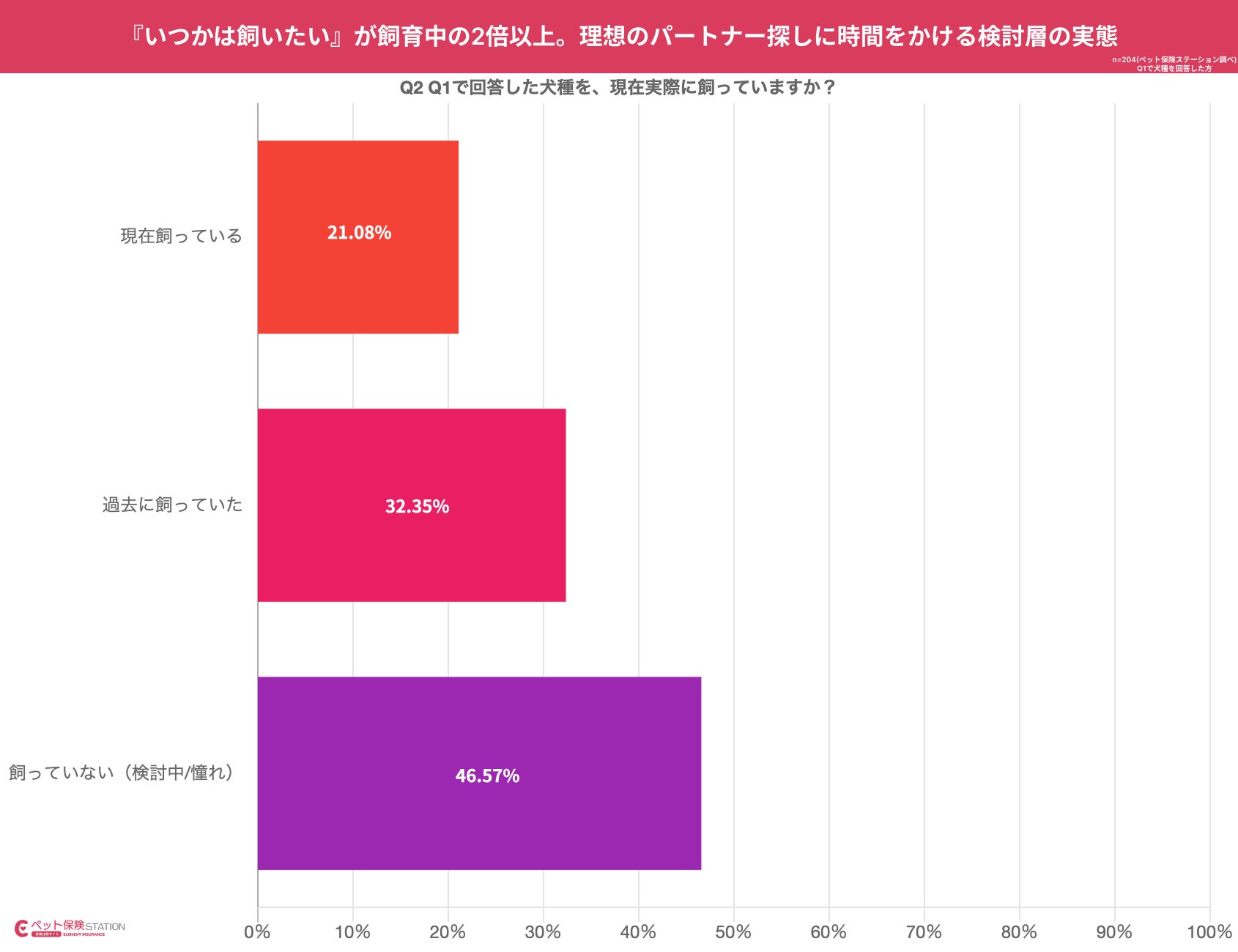 特定の犬種に興味を持つ層のうち、「飼っていない(検討中/憧れ)」が46.57%と最多で、実際に「現在飼っている」層(21.08%)の2倍以上にのぼりました。