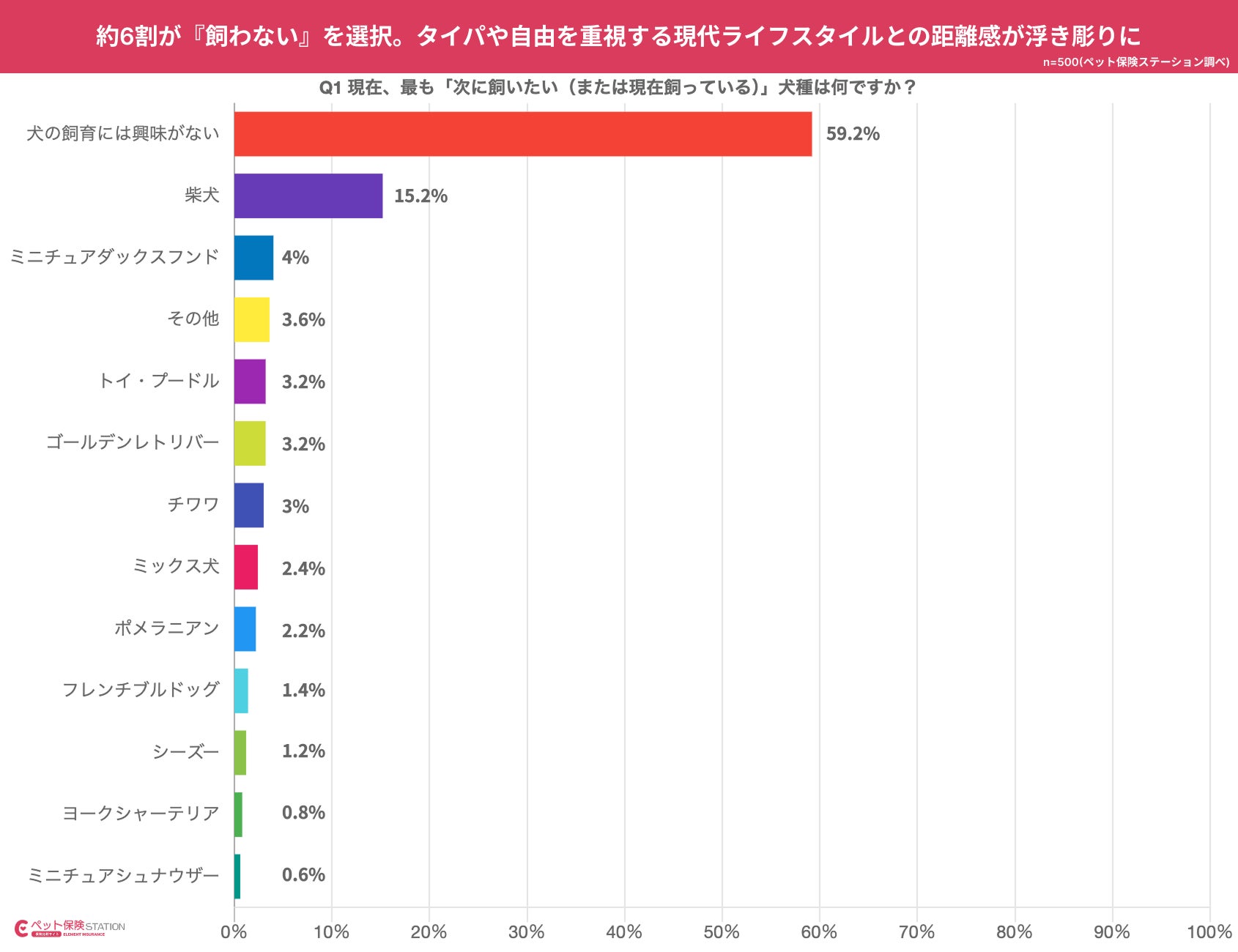 《株式会社エレメント》(本社:神奈川県川崎市、代表取締役:近藤勉)は、ペット保険比較サイト「ペット保険STATION(https://www.pets-station.info/)」において、全国の23〜99歳、男女500人を対象に人気犬種と飼育の実態関するアンケート調査を実施しました。