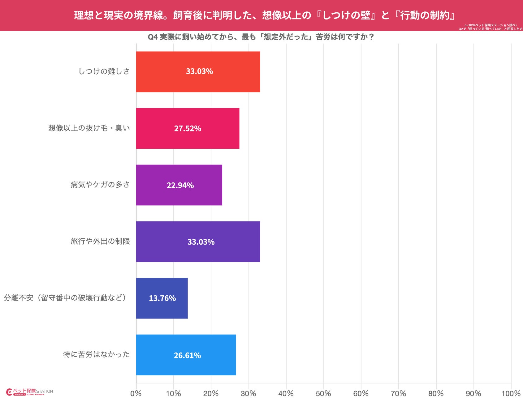 飼育経験者が挙げた「想定外の苦労」(複数回答)では、「しつけの難しさ」と「旅行や外出の制限」が33.03%で同率1位となりました。