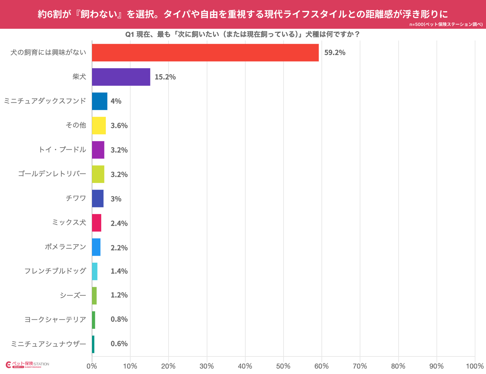 《株式会社エレメント》(本社:神奈川県川崎市、代表取締役:近藤勉)は、ペット保険比較サイト「ペット保険STATION(https://www.pets-station.info/)」において、全国の23〜99歳、男女500人を対象に人気犬種と飼育の実態関するアンケート調査を実施しました。