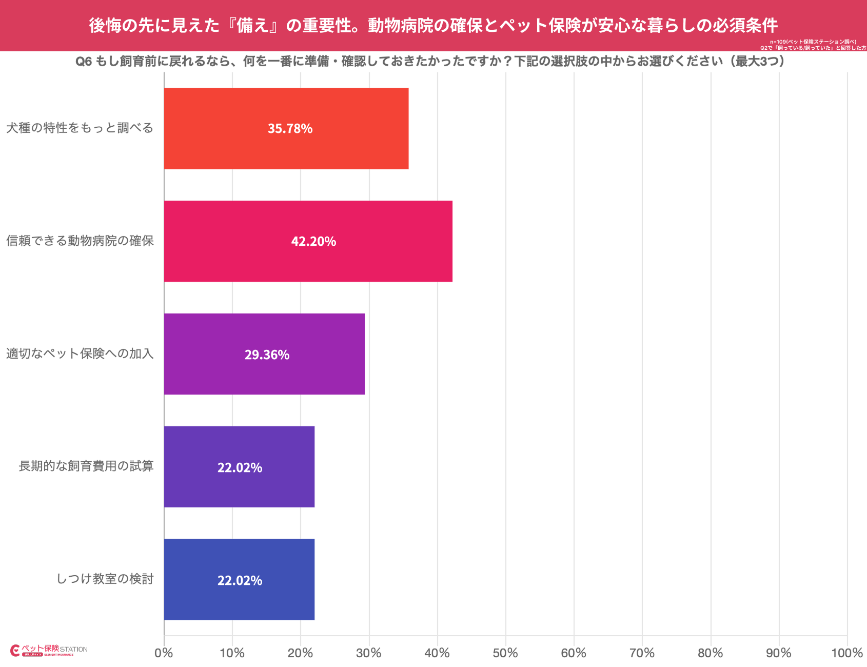 次いで「犬種の特性把握」(35.78%)、「適切なペット保険への加入」(29.36%)となりました。