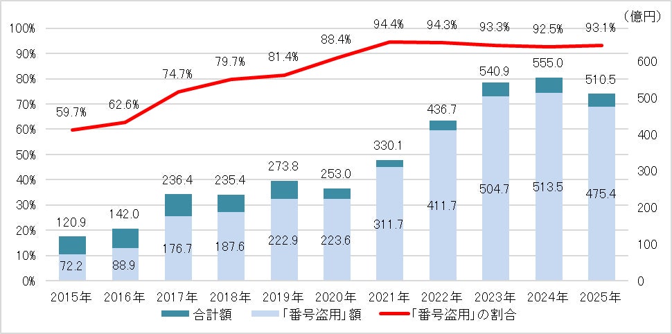 2025年のクレジットカード不正利用被害の合計は510.5億円となり、依然高止まりの状況が続いています(図表1参照)。また、被害の約75%がフィッシングに起因すると推計されており※2、フィッシング対策はクレジットカード業界における重要課題の一つとなっています。さらに、フィッシング報告件数は年間で約245万件に達しており(図表2参照)、脅威は拡大を続けています。