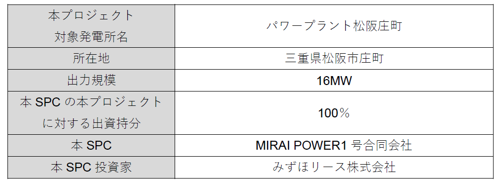 本プロジェクトは、本SPCを通して出資参画した青森県上北郡六ヶ所村、茨城県高萩市安良川、三重県鳥羽市堅子町、三重県津市白山町、熊本県球磨郡錦町、三重県松阪市嬉野釜生田町、岩手県久慈市侍浜町、鹿児島県指宿市山川大山において稼働する8か所の特別高圧太陽光発電所に続く第六弾として、三重県松阪市庄町において稼働する1か所の特別高圧太陽光発電所(出力規模16MW)を対象としており、各発電所を合わせた出力規模は累計244MWとなります。