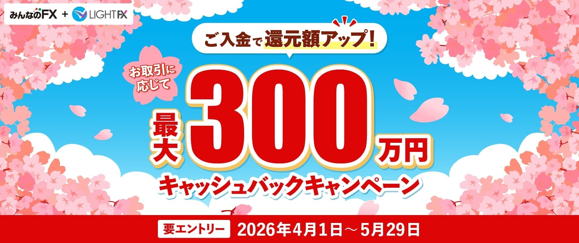 トレイダーズホールディングス株式会社(東京証券取引所スタンダード市場8704)のグループ会社で、外国為替証拠金取引事業(FX取引)等を営むトレイダーズ証券株式会社(本社:東京都渋谷区、代表取締役:須山 剛、以下「トレイダーズ証券」)は、2026年4月1日(水)より外国為替取引サービス「みんなのFX」および「LIGHT FX」において、「最大300万円キャッシュバックキャンペーン」を実施することを決定しました。