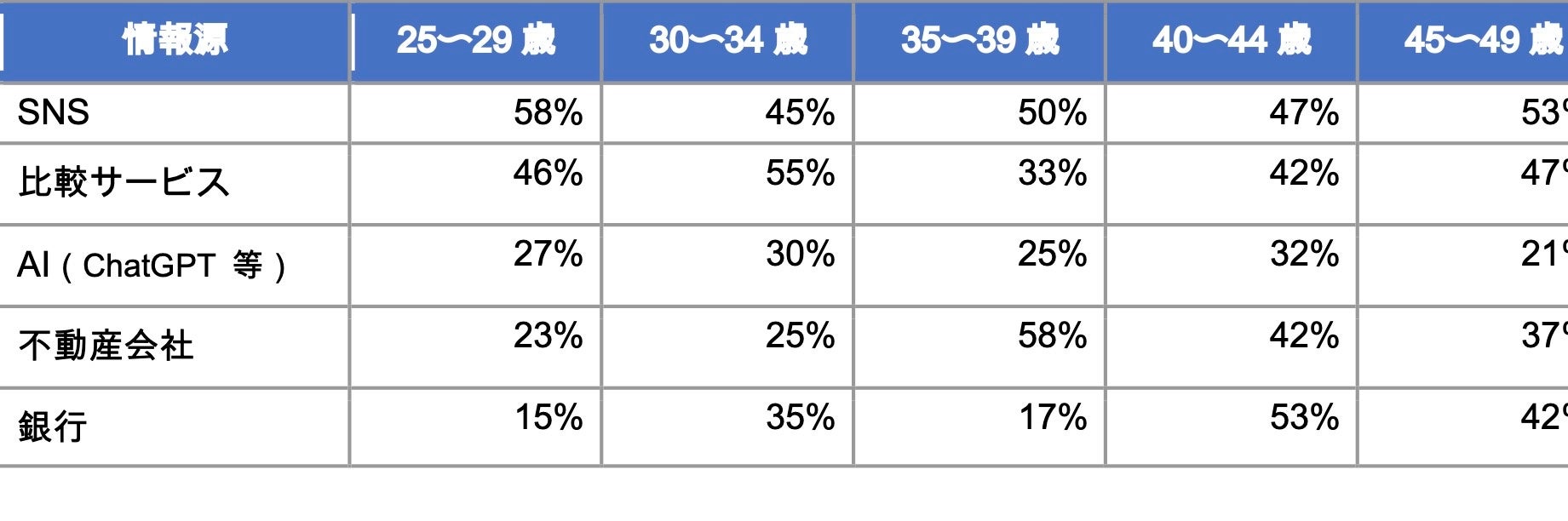銀行を情報源とする割合は25〜29歳で15%、50〜54歳で56%と世代差が大きく、若い世代は銀行よりオンラインで情報を集めています。AI(ChatGPT等)は40〜44歳の32%が最高で、住宅購入の中心世代にもAI利用が広がっています。