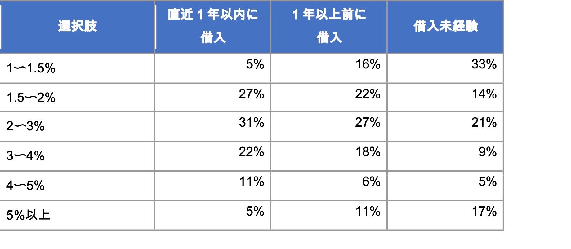 一方、住宅ローンを借りたことがない人では「1〜1.5%」が33%と最多である一方、「5%以上」も17%あり、金利の相場観にばらつきが大きい状態です。