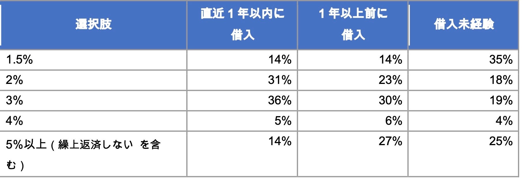 一方、住宅ローンを借りたことがない人では「1.5%」が35%と最多である一方、「5%以上(繰上返済しない を含む)」も25%あり、繰上返済の基準についてバラツキが大きいといえます。