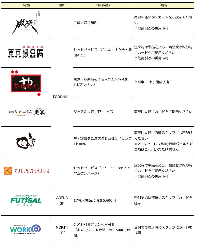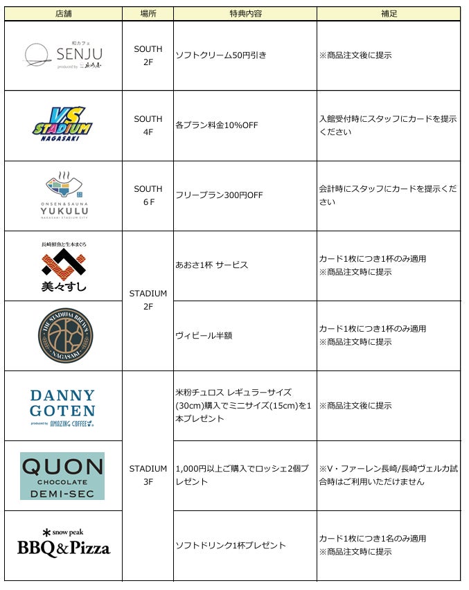 長崎スタジアムシティ内の一部店舗において、三井住友カードのナンバーレスカード・Olive(オリーブ)をお持ちのお客様を対象とした優待特典を提供致します。現時点で優待対象となる店舗及びサービスは以下となります。