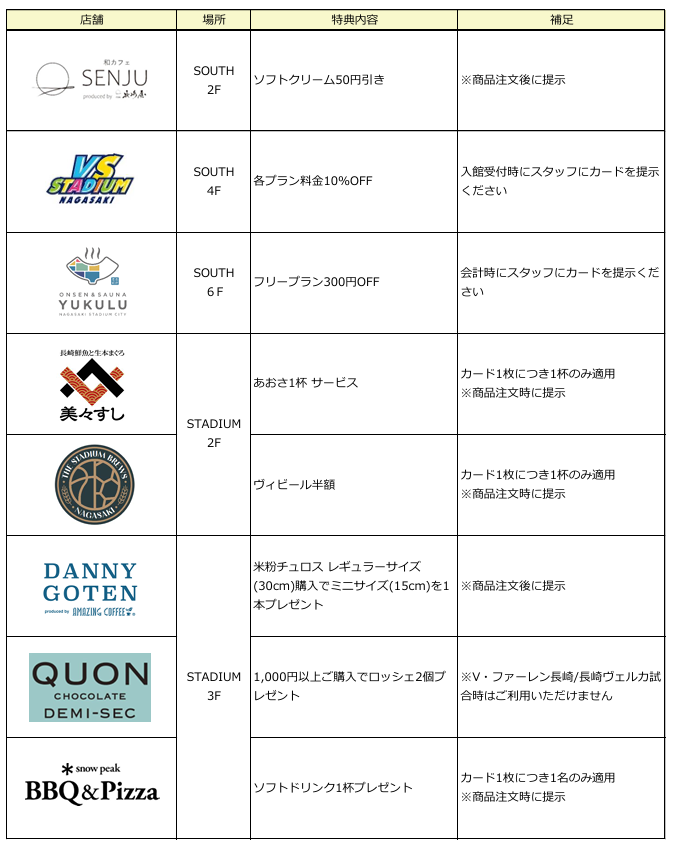 長崎スタジアムシティ内の一部店舗において、三井住友カードのナンバーレスカード・Olive(オリーブ)をお持ちのお客様を対象とした優待特典を提供致します。現時点で優待対象となる店舗及びサービスは以下となります。
