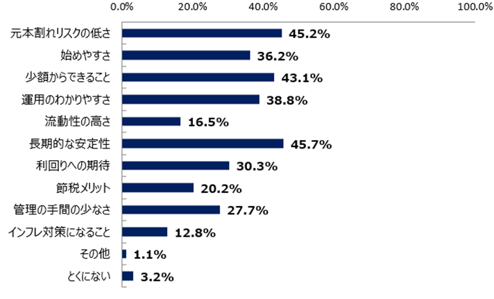 資産形成の手段を選ぶ際に重視されているのは、「長期的な安定性」「元本割れリスクの低さ」「少額からできること」でした。高いリターンよりも、無理なく始められて長く続けやすいことが重視されており、堅実志向の強さが表れています。