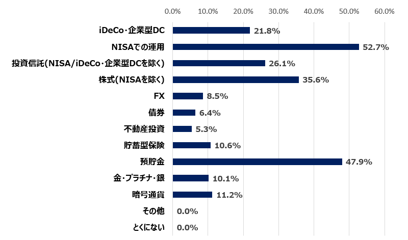 NISAでの運用が過半数で最も高く、預貯金も約半数に上ることから、制度を活用した投資と安全資産を組み合わせながら、堅実に資産形成を進める傾向が見られました。