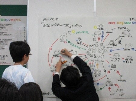 当日は、小学5年生から中学2年生までの23名が参加し、社会や科学の発展とお金の関係性、個人がお金を使うことの意義について考えた後、グラフィックレコーディングを用いた「お金の流れの地図」づくりに挑戦しました。