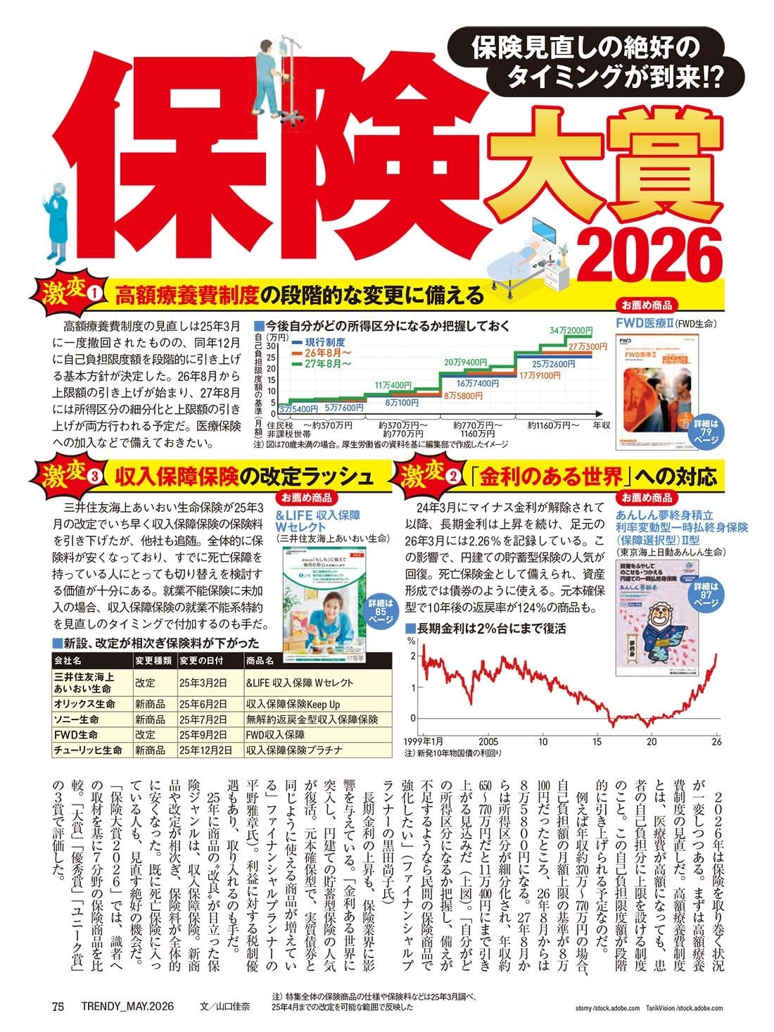株式会社日経BP(本社:東京都港区、社長CEO:井口 哲也)は2026年4月3日、個人生活を刺激する流行情報誌「日経トレンディ」2026年5月号で「保険大賞2026」を発表しました。「がん保険」や「医療保険」など7分野の保険商品を対象に、「大賞」「優秀賞」「ユニーク賞」を選出しています。
