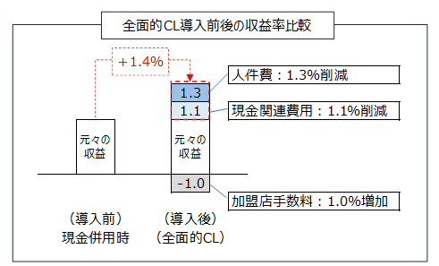 ①に関しては全面的CL導入効果として、加盟店決済手数料が増加する一方で、キャッシュレスによる合理化により人件費、現金関連費用(セキュリティコスト、入出金・両替手数料等)が改善することで、営業利益率が平均で約1.4%改善することが分かりました(下図参照)。