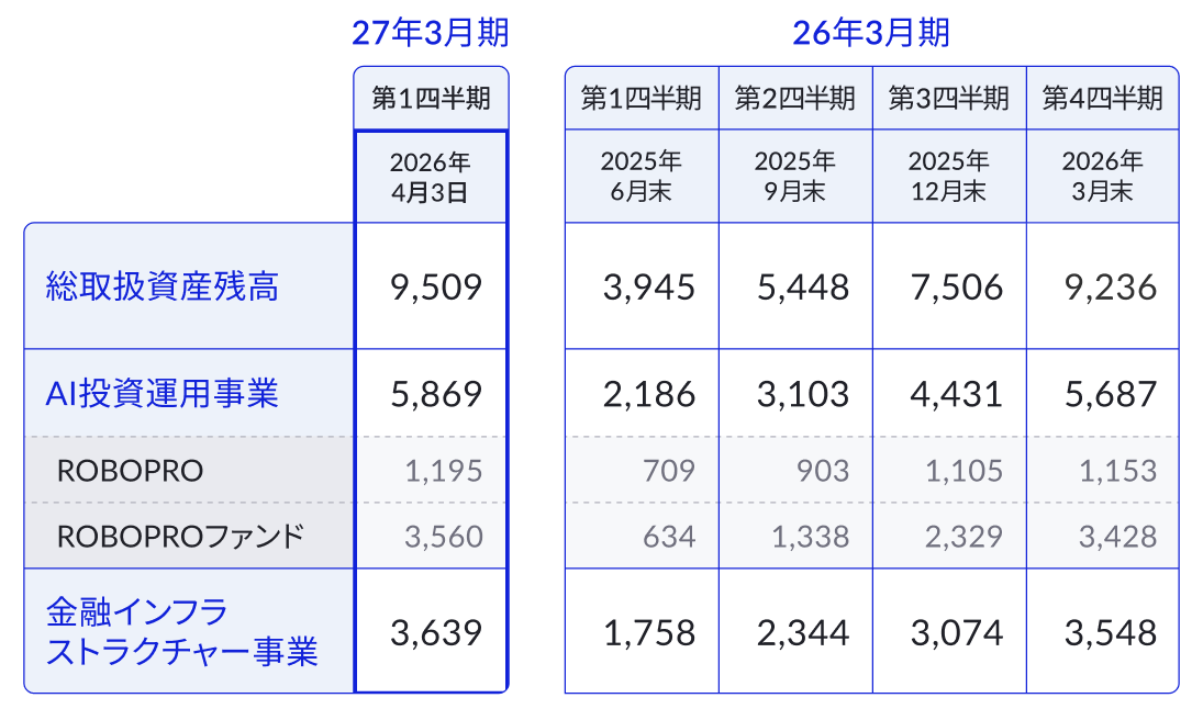 当社グループは、「ROBOPRO®」、「4RAP」を活用した投資一任運用サービスおよびAI予測を活用した投資助言など、多様な金融ソリューションを提供しています。2026年3月からは、株式会社FOLIOが投資助言を行う「ゴールドマン・サックス社債/ROBOPRO戦略ファンド2026-03」(SBI岡三アセットマネジメント株式会社設定)の提供が始まり、総取扱資産残高の増加につながっています。
