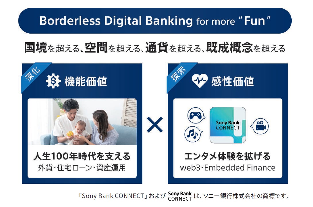 ソニー銀行は「Borderless Digital Banking for more “Fun”」をコンセプトに、国境・通貨・空間の垣根を超えて、人生100年時代における個人と家族の安心を支える機能価値と、エンタテインメントとの連携を通じた体験の場の拡張や不の解消による感性価値を創出し、お客さまに新たな感動体験・価値提供を目指して挑戦を続けていきます。