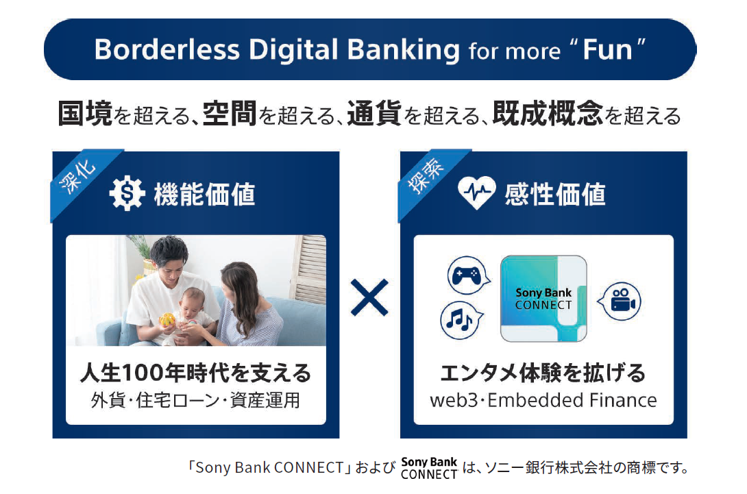 ソニー銀行は「Borderless Digital Banking for more “Fun”」をコンセプトに、国境・通貨・空間の垣根を超えて、人生100年時代における個人と家族の安心を支える機能価値と、エンタテインメントとの連携を通じた体験の場の拡張や不の解消による感性価値を創出し、お客さまに新たな感動体験・価値提供を目指して挑戦を続けていきます。