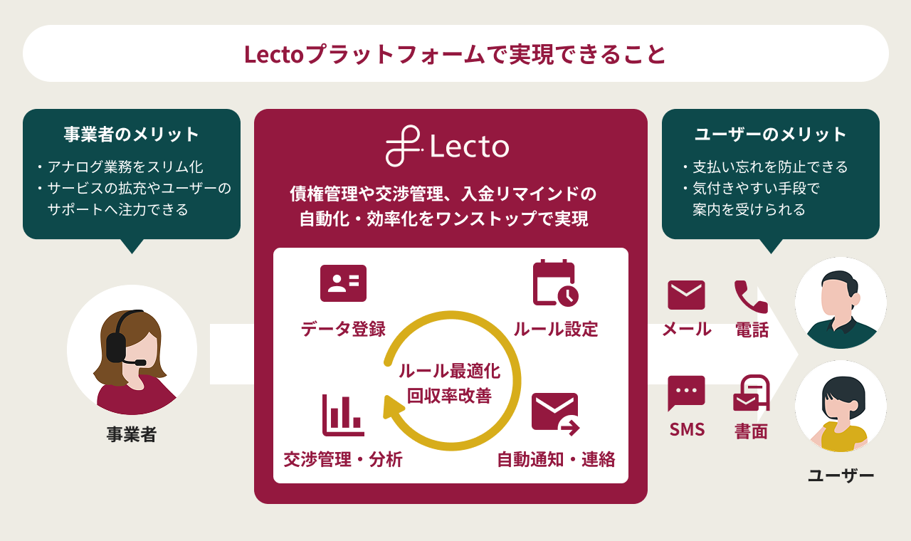 Lectoは、「督促回収テック」を展開するFintech関連企業です。金融サービスやリテール・サブスクリプションサービスの裏側(バックエンド)にある面倒な実務や複雑で属人化しやすい業務フローを改善し、債権管理(顧客管理)・回収からオフバランスまで一気通貫での課題解決を目指しています。それにより顧客満足度、サービスUXの向上を目指すことが可能になります。