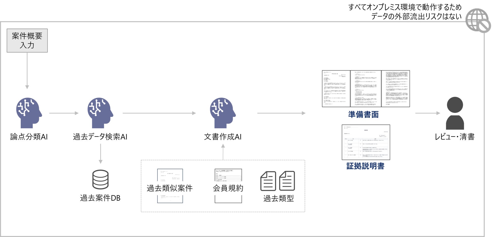 訴訟関連の機密情報を取り扱うため、すべてのシステムをオンプレミス環境で構築。外部への情報漏洩リスクを極小化。 -