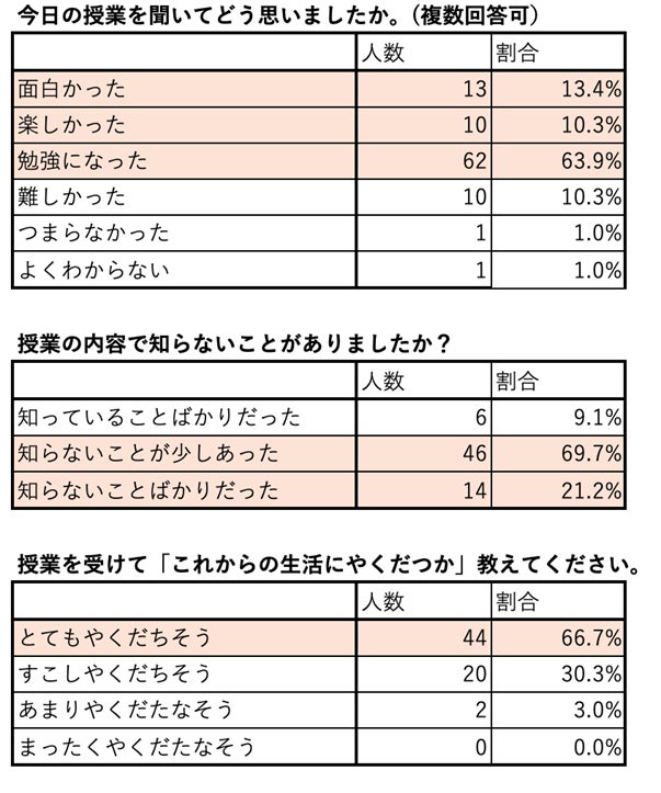 出前授業に参加した児童の事後アンケート※では、回答者の97%が授業を受けてこれからの生活に「役立ちそう」と回答しました。