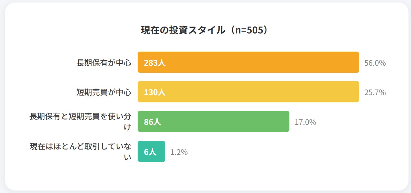 調査の結果、投資スタイルの最多は「長期保有が中心(56.0%)」であり、使い分け派を含めると全体の約7割以上が長期的な視点で運用している実態が判明しました。