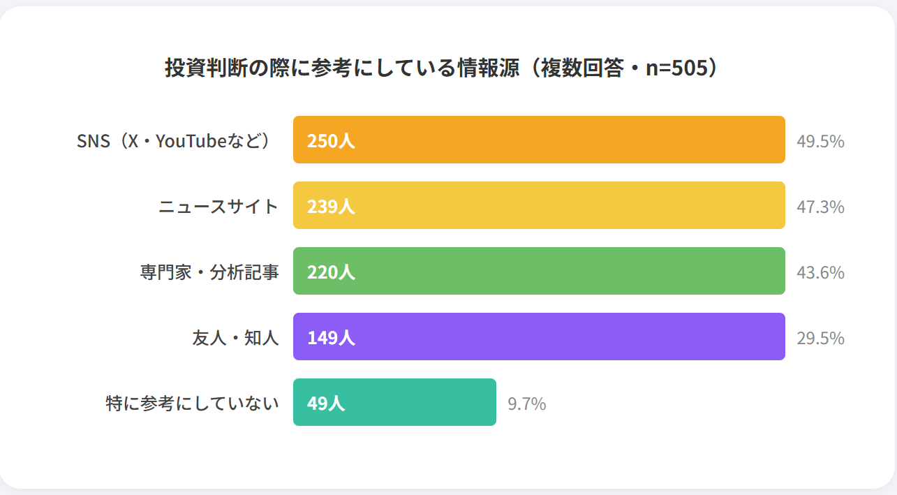 投資判断の際に参考にしている情報源を複数回答で尋ねたところ、「SNS(X、YouTubeなど)」が250人(49.5%)で最多でした。