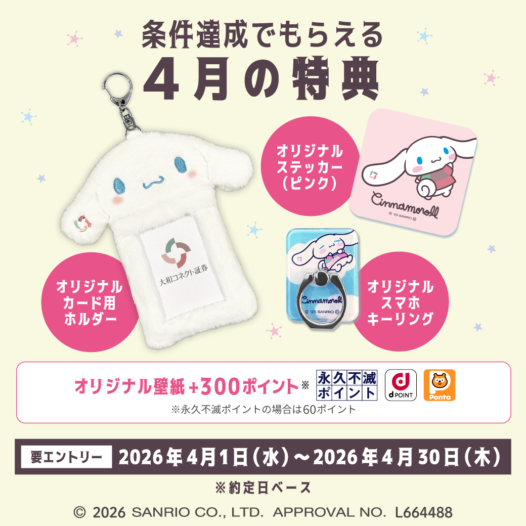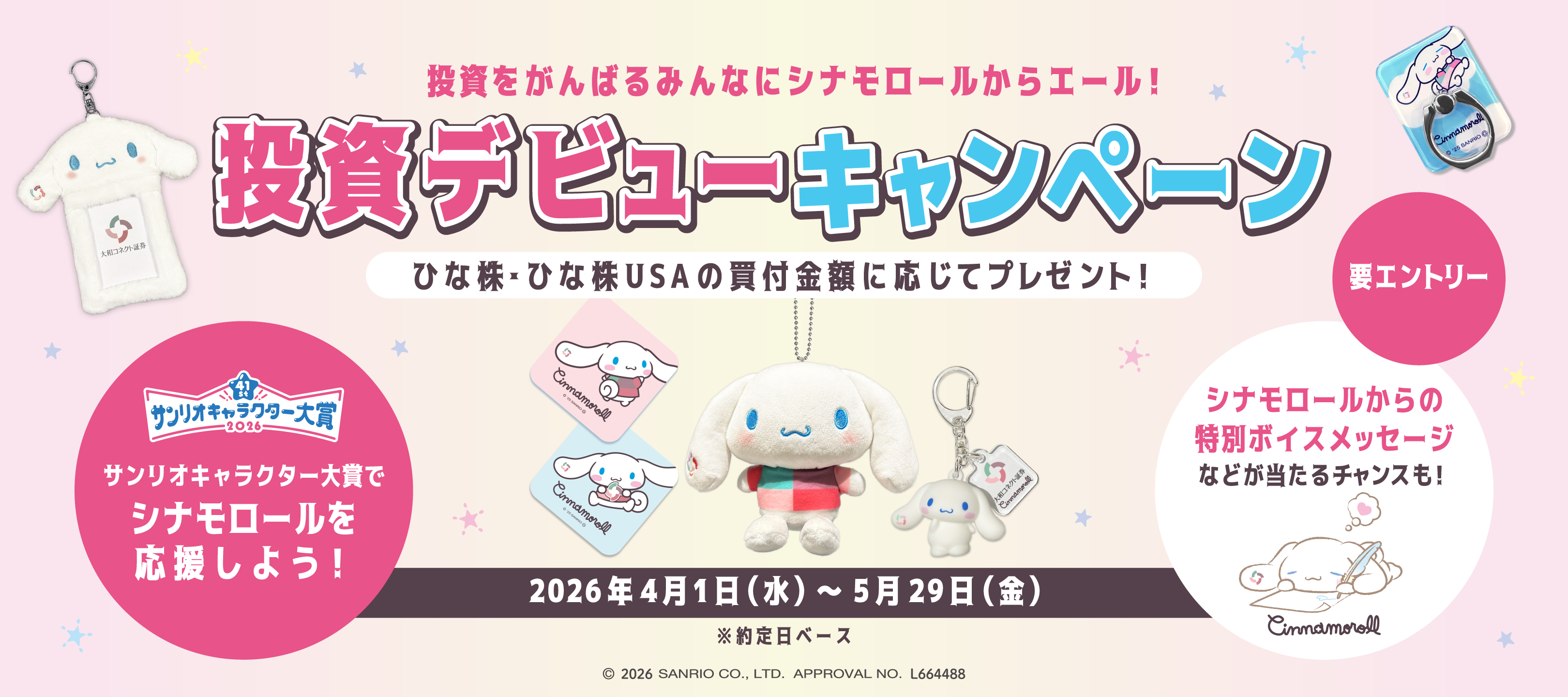 さらに!ひな株・ひな株USAを100万円以上買付いただいたお客さまの中から抽選で3名さまに「シナモロールからあなただけへの特別ボイスメッセージ」をお送りいたします!また、20名さまにサンリオピューロランド デイパスポート(ペア)、10名さまに株の購入代金10,000円をプレゼントいたします!